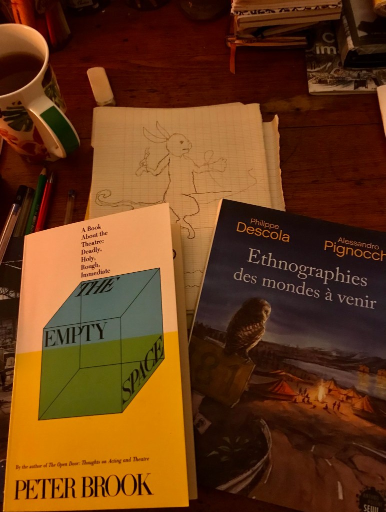 L’illustration du jour, elle, étant tout en lien avec L’Horloger des Brumes et le “personnage” du cucube-penseur dont l’intérieur semble “vide”, alors d’où provient la pensée ? Hier soir, j’ai eu envie de lire en anglais (en mettant de côté le livre d’Alessandro Pignocchi et Philippe Descola (j’y reviendrai). Dans la bibliothèque, c’est le livre de Peter Brook qui a retenu mon attention, en raison de son titre, The Empty Space,* puis, de l’image sur la couverture.